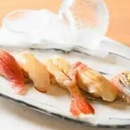 北海道産の季節の魚介類が味わえます。シャリには赤酢と米酢のブレンドを使い、赤酢の香りと米酢のまろやかさで魚介類の旨味を引き出しています。頬張ると、茨城県産コシヒカリがふわりとほどける食感が楽しめます。その日に仕入れた新鮮な海の幸をご堪能いただけます。寿司一筋の店主拘りの1貫をご賞味あれ。